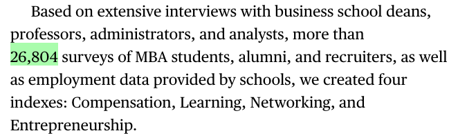 为了这份榜单的准确性,Bloomberg在今年,通过调查26,804名全职在读MBA学生、校友和招聘人员,基于他们的回答,并综合每所学校学生毕业后的薪酬和就业数据,才最终有了这份榜单。