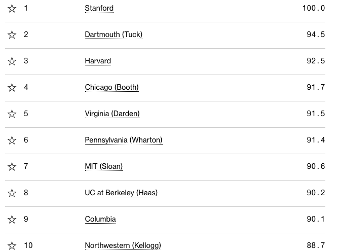 哈佛商学院险些跌出前三,仅以不到一分的优势超过了芝加哥大学的布斯商学院。 而斯坦福的商学院虽然强,但是榜单能给出100分的满分,也是让人觉得不可思议。