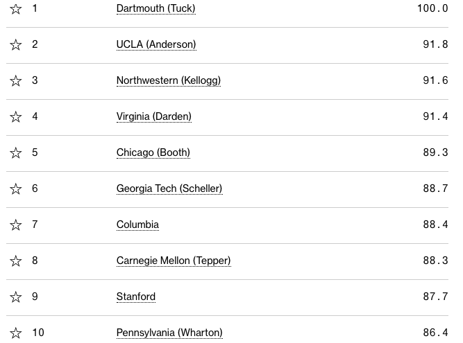 前十商学院分别是: 斯坦福商学院,达特茅斯学院塔克商学院、哈佛商学院、芝加哥大学布斯商学院、弗吉尼亚大学达顿商学院、宾夕法尼亚大学沃顿商学院、麻省理工斯隆商学院,加州大学伯克利分校哈斯商学院,哥伦比亚商学院,以及西北大学凯洛格商学院。
