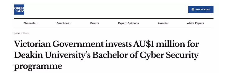 业为主导的澳大利亚网络安全发展网,帮助澳大利亚发展和壮大网络安全行业。澳大利亚迪肯大学作为合作伙伴,加入到澳大利亚网络安全的问题&解决方案的探究之中。澳大利亚维州政府投资$1,000,000用于迪肯大学“网络安全学士学位"的教学中,希望可以培养出更多的优秀人才。