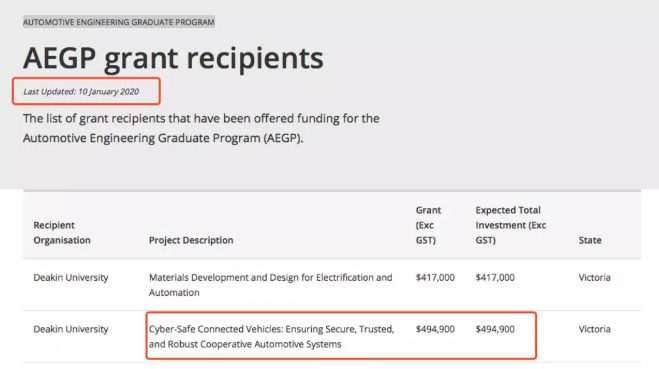 就在2020年1月,由澳大利亚政府主导的“汽车工程研究项目AUTOMOTIVE ENGINEERING GRADUATE PROGRAM(AEGP)”中,澳洲政府拨款$494,900澳元,希望迪肯大学可以对网络空间安全与车辆行驶安全之间的关系进行研究与人才培养。