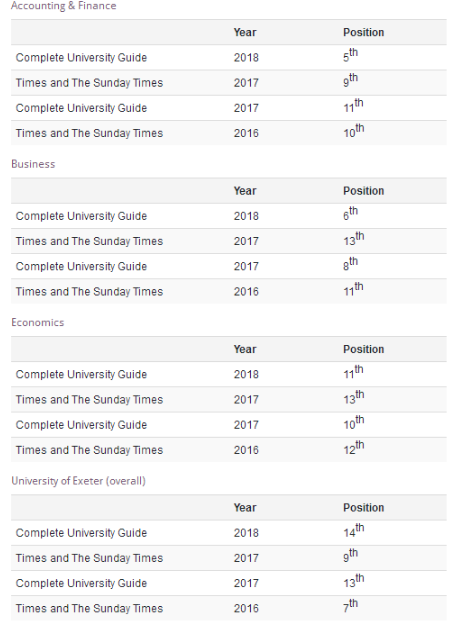 埃克塞特大学商学院在全英国大学排名中位居前列。这些排名通过多方面的评估来对各个高校及其专业领域进行排名,评估方面主要包括入学要求,科研评价,学生/员工比例、退学率、学生满意度、学生的学历等级和毕业生的就业情况。