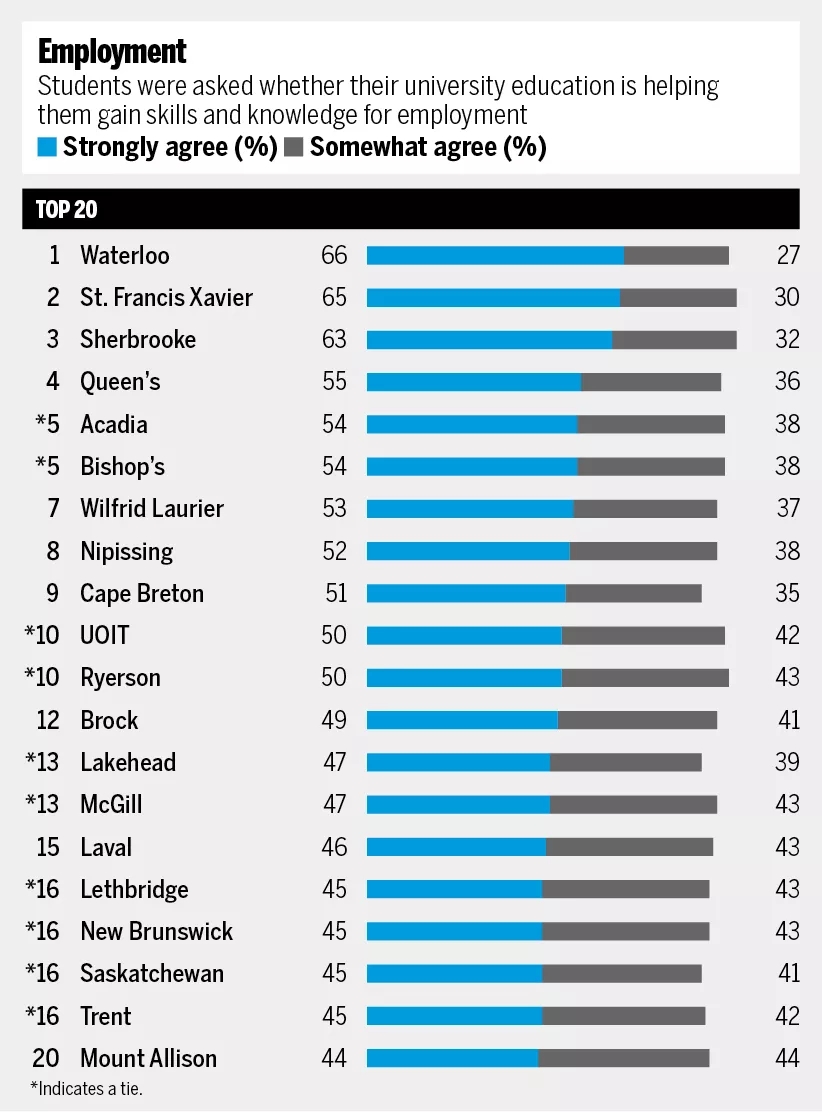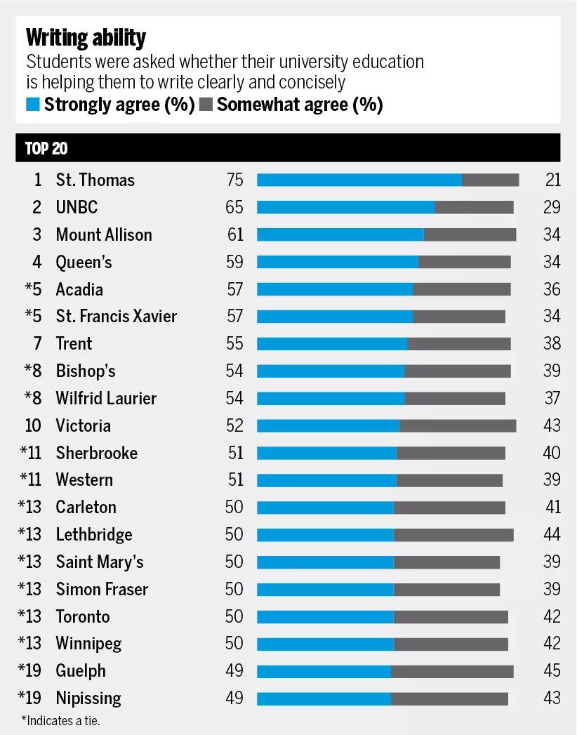 得到好评最多的学校:圣汤姆斯大学, UNBC ,蒙特爱立森大学,还有皇后