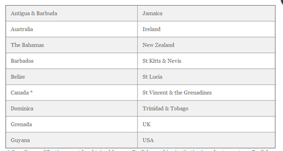 Antigua an Barbua, Australia, Barbaos, Belize, Botswana, Cameroon (only if the qualification is taught in English), Canaa, Caribbean / West Inies (English-speaking Caribbean Commonwealth territories), Dominica, Fiji, Gambia, Ghana, Grenaa , Guyana, Irelan, Irelan, Jamaica, Kenya, Macau (only if the qualification is taught in English), Malawi, Malta (only if the qualification is taught in English), Mauritius, New Zealan, Nigeria, Singapore, South Africa, St Kitts an Nevis, St Lucia, St Vincent an the Grenaines, Swazilan, Tanzania, The Bahamas, Trinia an Tobago, The Netherlans (where the egree is taught entirely in English), Ugana, Unite Kingom, Unite States of America, Zambia, or Zimbabwe.