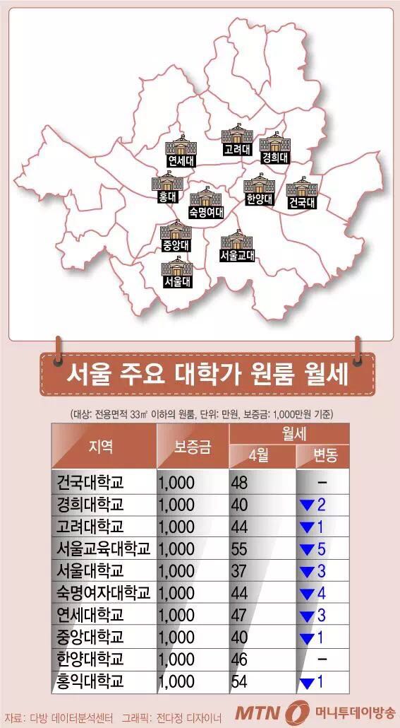 租金第二高的是麻浦区的弘益大附近的单间。这里的价格是保证金1000万,月租54万。 第三位的是广津区的建国大学附近,月租48万韩元。 第四位的是西大门区的延世大附近,月租47万韩元。 接下来依次是汉阳大(城东区,46万),高丽大(城北区,44万),淑明女大(龙山区,44万),庆熙大和中央大(东大门区和铜雀区,44万),首尔大(冠岳区,37万)。