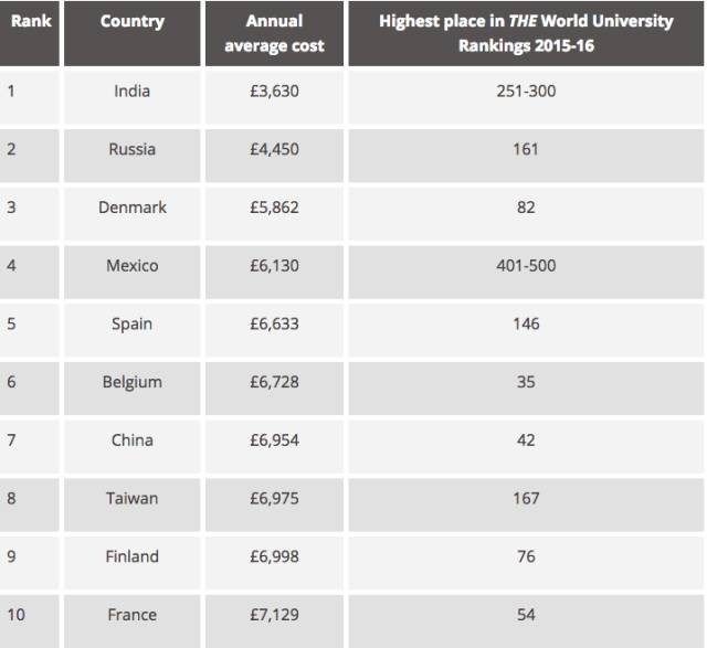 世 界最大的三个排行榜 : QS 、 TIMES 和 ARWU RANKING 每年都会定时发布全球大学排名。最新的 TIMES 排行榜联合 FAIRFX (旅行货币兑换公司) 统计了全球留学费用最高和最低的国家和地区。