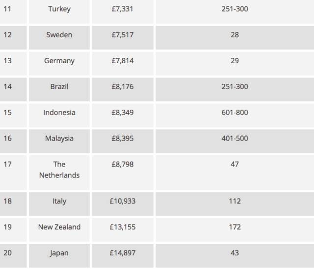 Top5-10 中热门国家为:英国第 5 ( 2.1 万英镑,约 18.5 万人民币一年)、中国香港第 6 ( 2.0721 万英镑)、加拿大第 7 ( 1.9323 万英镑)。