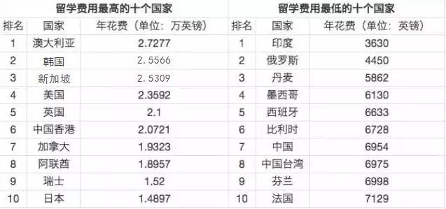 来澳洲留学,一年就要花掉 24.3 万人民币 。排名第 2 的为韩国, 2.56 万英镑一年。
