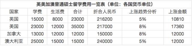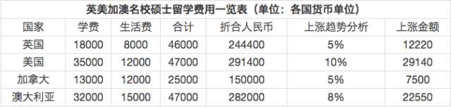 从上可以明显看出, 英国 名校硕士留学学费平均约 18000 英磅,生活费平均 8000 英磅,总费用平均 46000 英磅,预估每年会有 5% 左右的涨幅;