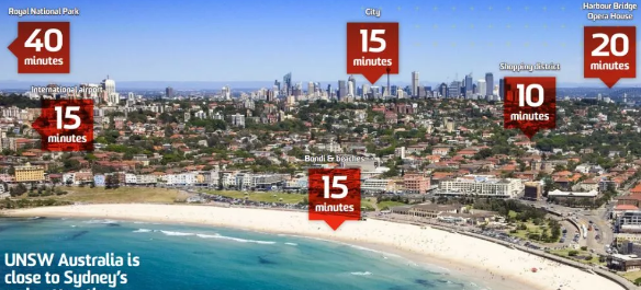 新南威尔士大学(UNSW)位于悉尼郊区的肯辛顿,距离Coogee海滩和邦迪海滩仅几英里。最近的海滩,库吉,是一个梦幻般的游泳点。新南威尔士大学靠近悉尼的皇家兰德威克赛马场。