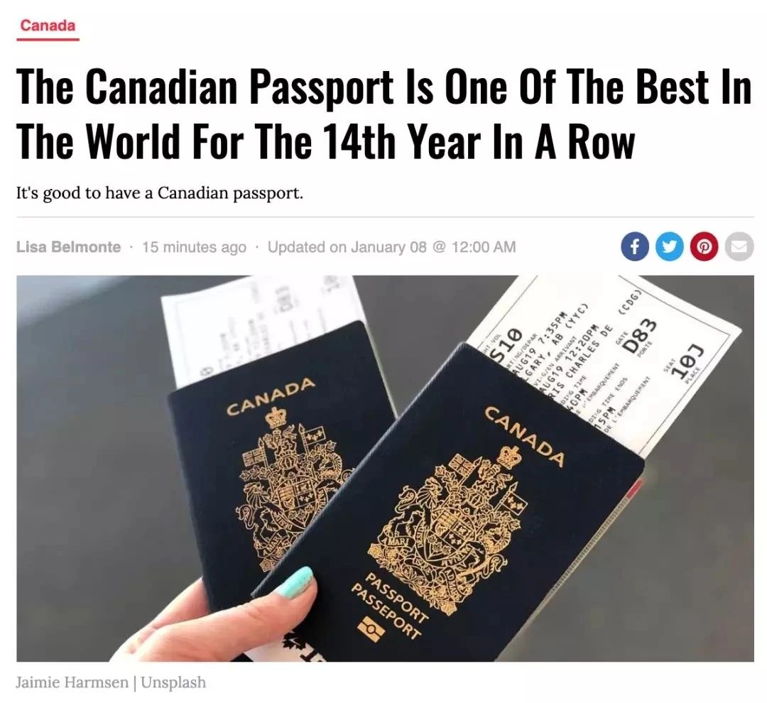 根据2020年全球知名的移民及投资战略企业亨利伙伴公司(Henley & Partners)发布的《亨利护照指数和全球出行报告》来看,加拿大以183分的成绩与澳大利亚,捷克共和国,马耳他和新西兰并列 第9位 。这已经是加拿大连续14年挤进全球最强护照排行榜了,加拿大护照的免签实力依旧抗打耐用再次被证明。