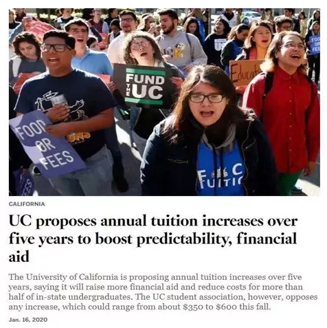 此外,一些反对者还认为,向某些学生收取的费用甚至比其他费用还要高。 因为根据第一个方案,如果 2020 年入学的学生支付 13176 美元的学杂费,那 2024 年入学的加州学生将支付 15414 美元,这对后面的学生来说也是不公平的。