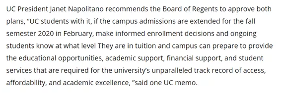 UC 的校长 Janet Napolitano 强烈建议董事会批准这两个方案,她说: “2020年秋季的校园招生应响应这一计划,让学生做出明智的入学决定。 而且学校可以提供教育机会、学术支持、财政支持、和各项学生服务。 这些都可以让加大获得客观的访问记录、经济可负担性、和卓越学历的必要条件。 ”