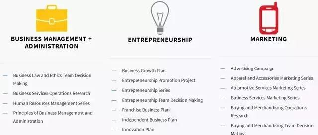 DECA涉及60多个比赛项目,涵盖市场营销、商业管理、金融、酒店管理和旅游等类别。比赛项目如下图所示。