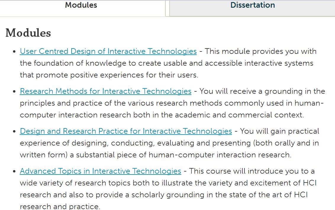 巴斯会根据已经工作的毕业生的反馈及时更新教学内容,会给在读学生的项目学期提供专业的知道。另外,这个专业是有专业认证的,毕业后有实习机会,也可以不用考试,就申请到专业相关的工作岗位。如果想毕业后有学校提供的实习的同学可以选择这个专业 Human Computer Interaction MSc – 2 years incluing placement year 。