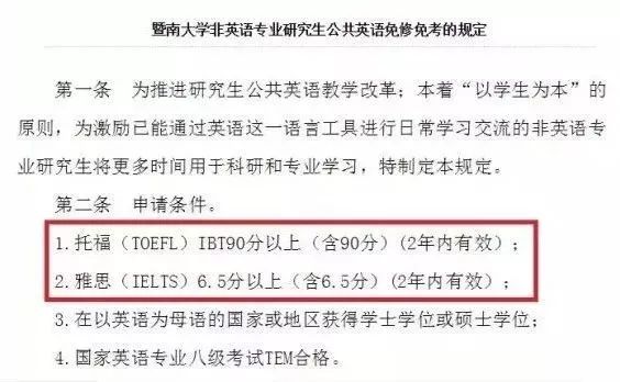 再以暨南大学为例,规定“ 托福IBT成绩≥90分,或雅思成绩≥6.5分”的学生(非英语专业) ,就可以申请研究生公共英语免修、免考。 有此相关制度的还有浙江大学、武汉大学等等。