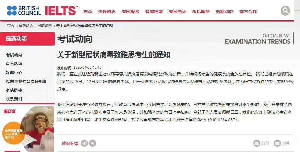 > 雅思考试官方紧急通知;全国各地均可取消考试