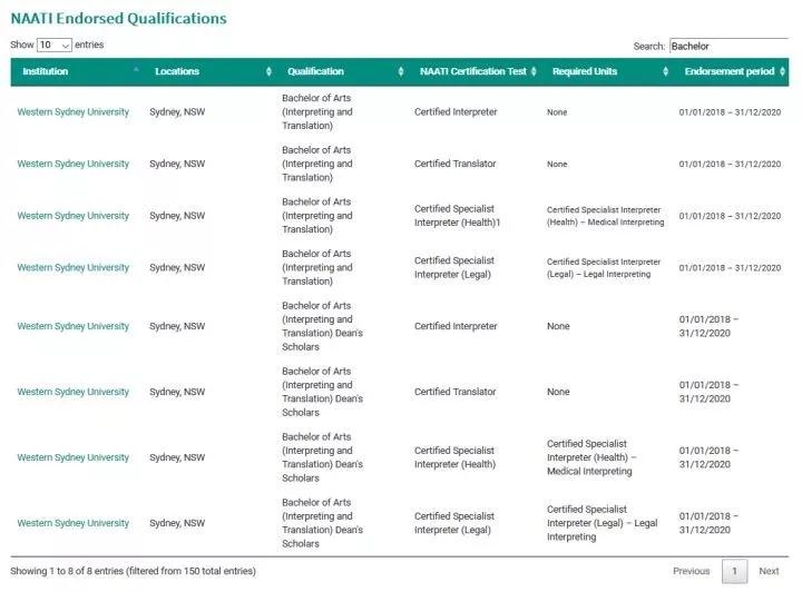 西悉尼大学最著名的莫过于其人文学院,以及其所提供一系列关于翻译专业。西悉尼大学早在1984年就开设了翻译与口译学位课程,该课程是全澳洲唯一一个被NAATI认证超过20年的学位课程。西悉尼大学的翻译本科学位是30年来全澳大利亚唯一获得 NAATI 认可的翻译本科学位,不是之一,是唯一!(见下图)这也显示了 NAATI 对于西悉尼大学翻译教学质量的肯定。