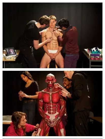 另外作为一所艺术气息浓厚的大学,课堂上少了艺术怎么行,教授别出新意,运用真人模特教授人体解剖课程。该教授与五名艺术系的学生合作,利用人体彩绘,在模特身上画出人体内部的构造,完成后是这样子的: