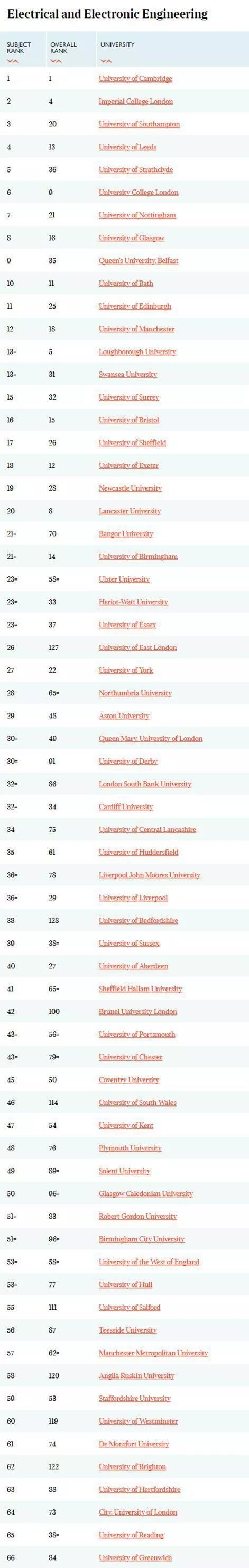 2020 年 TIMES 英国大学电子电气工程专业排名!
