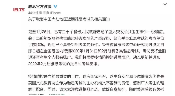 同样,雅思官方微博发布通知,自即日起在全国范围内取消2020年1月31日和2月所有各类雅思考试。