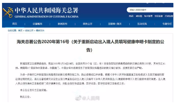 中国海关总署26日凌晨发布公告,宣布重新启动出入境人员填写健康申明卡制度。