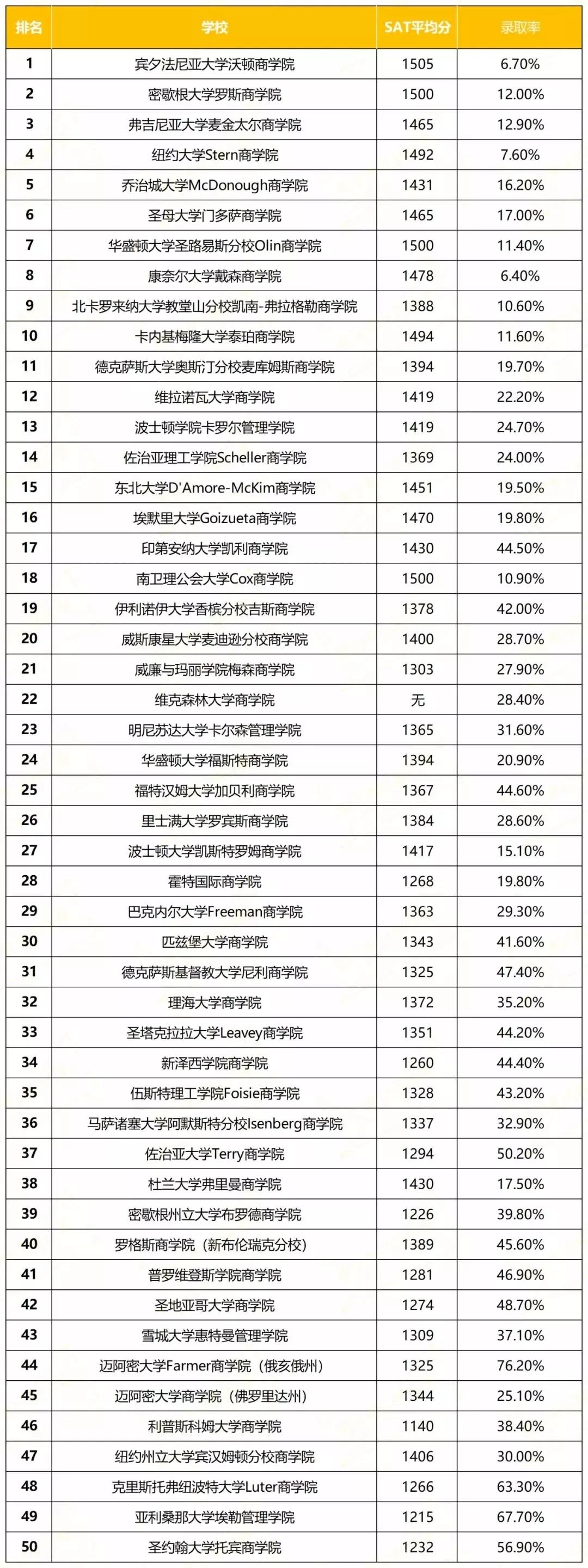 商学院申请信息网站Poets&Quants每年都会对本科商学院进行排名,排名主要参考三个因素:生源质量、学术评价、毕业生就业情况。排名中还附加有录取学生的平均SAT分数以及商学院院录取率。