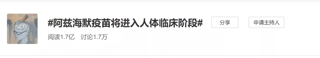 新年伊始, #阿兹海默疫苗将进入人体临床阶段# 这个科学严肃的话题打败无数娱乐八卦新闻,空降微博热搜榜并获得了上亿的曝光量!