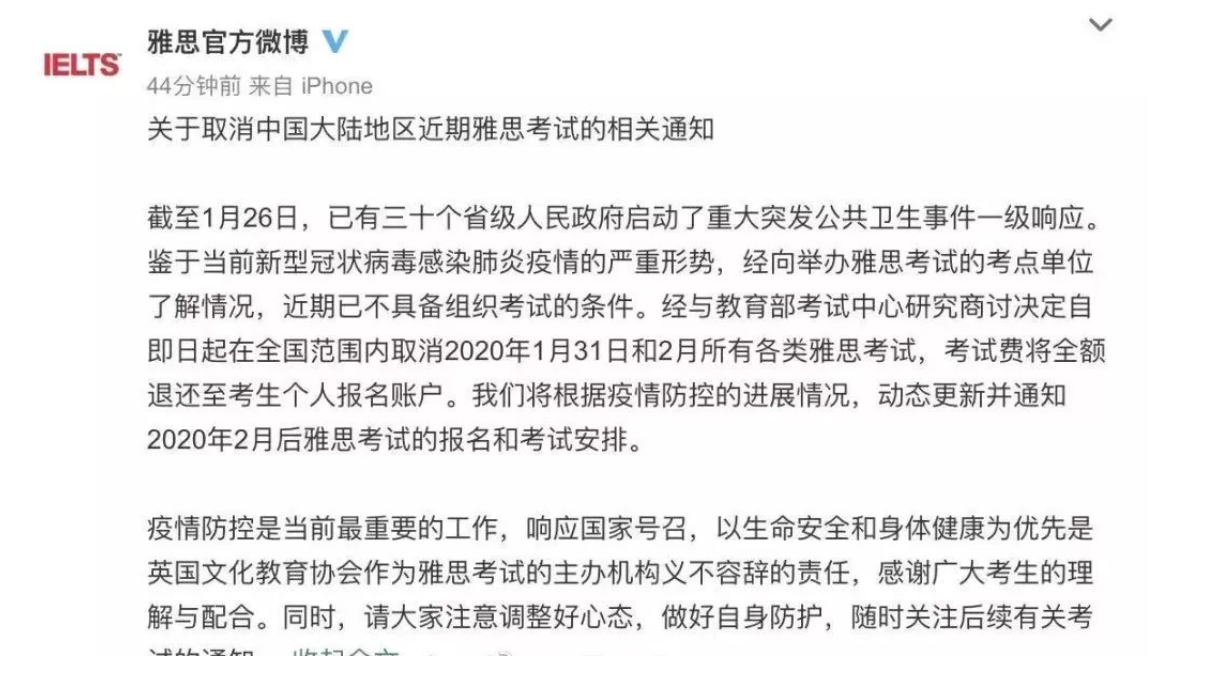 同样,雅思官方微博发布通知,自即日起在全国范围内取消2020年1月31日和2月所有各类雅思考试。
