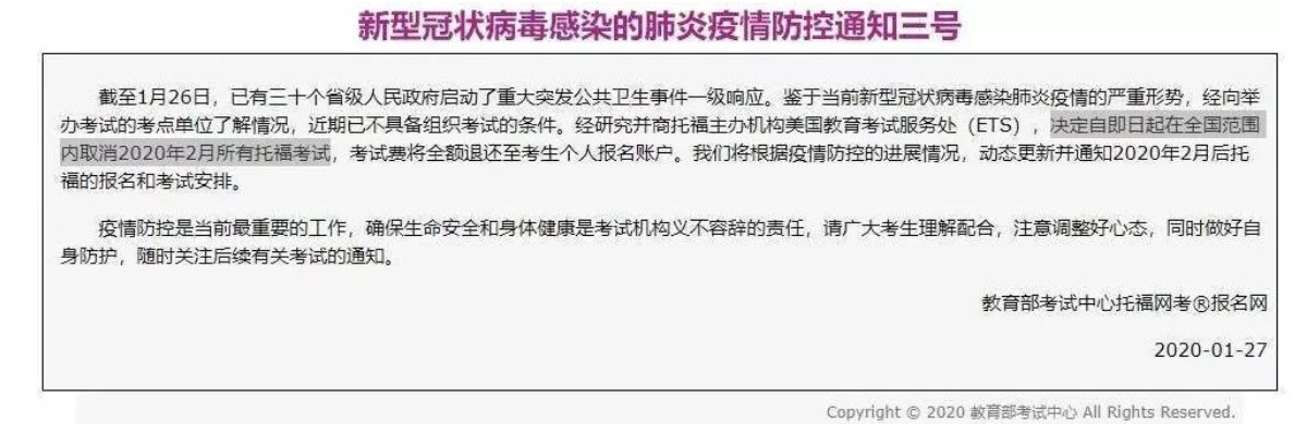 经ETS与教育部考试中心(NEEA)共同研究商议决定,自即日起在全国范围内(大陆地区)取消2020年2月所有托福考试和GRE普通考试,考试费将全额退还至考生个人报名账户。我们将根据疫情防控的进展情况,动态更新并通知2020年2月后托福和GRE考试的报名和考试安排。