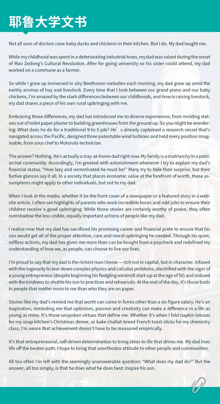 故事的一开头就很吸引眼球: Not all sons of octors raise babyucks an chickens in their kitchen.But I o. My a taught me. (不是所有医生的儿子都在厨房里养过小鸡、小鸭,而我却做过这样的事。 我爸爸教过我。 )这个开头的好处在于,它制造了很多悬念,给人发问的空间: 为什么在厨房养小鸡小鸭呢? 为什么爸爸会教儿子这个技能呢? 这篇文书是讲申请者对生物学的兴趣吗? 可能招生官还有别的发问。 所以,招生官会好奇地继续读下去。
