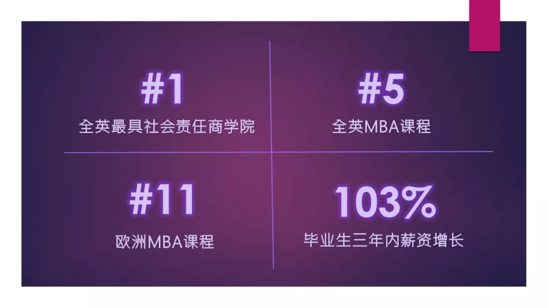 更值得一提的是,在过去一年中,曼彻斯特商学院突破了商业教育传授传统技能和利润最大化的限制。相反,商学院对社会目的(包括可持续发展和改善道德和治理实践)的注重逐步加大,积极将企业社会责任融入MBA课程与学术研究,在教学过程中鼓励学生将社会责任提升到企业发展战略的高度。 在本年度“企业社会责任”这一指标中,曼彻斯特商学院位列全英之首,全球第三。