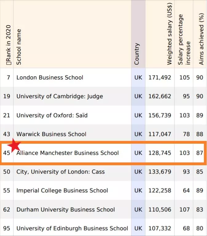 其中,在毕业后三个月内就业率(Employe at Three Months)表现方面,曼彻斯特商学院MBA在本年度排名中较2019年获得显著提升——高达 85% ;在薪资增长方面,校友毕业三年后加权平均年薪(Weighte Salary)达到了 128,745美元 ;薪资增长率(Salary Increase Rate)达到 103% 。