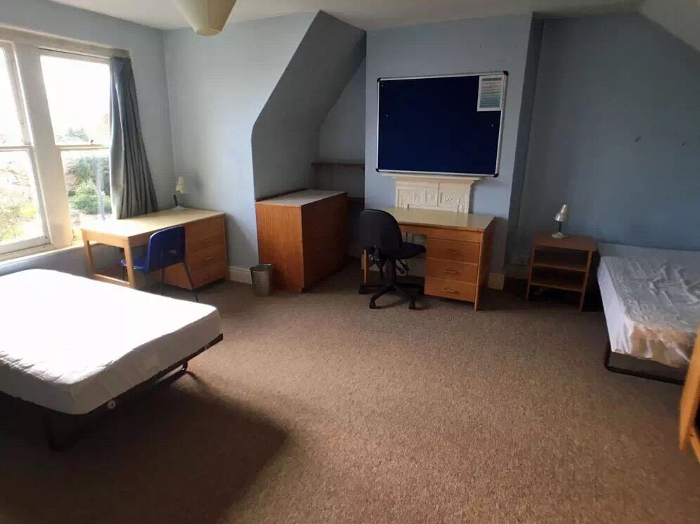 一间有两套家具(床、书桌、衣柜)的房间,适合两个学生住在一起。