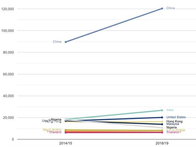 另一个重要的非欧盟市场,尼日利亚,2018/19学年的入学人数再次减少:从2014/15学年开始的五年里,这个市场下降了41%。尼日利亚目前在英国教育机构最重要的非欧盟市场中排名第六,仅次于中国、印度、美国、香港和马来西亚。