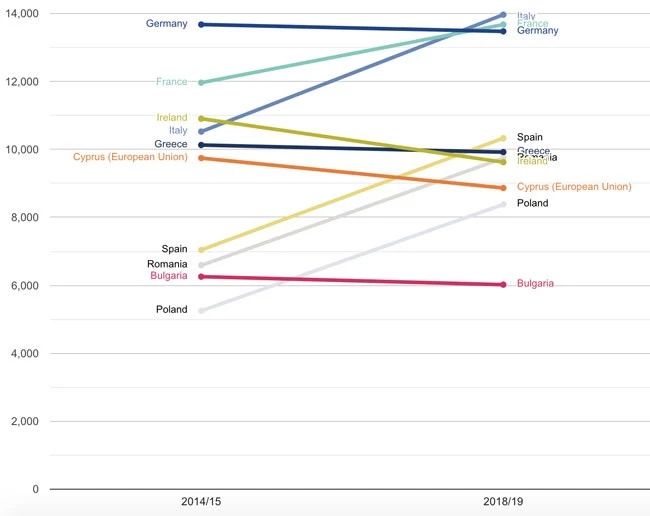 如下图所示,自2014/15年以来,在英国大学就读的意大利学生人数大幅增加,而同期德国学生人数则有所下降。 过去5年,西班牙、罗马尼亚和波兰也成为英国教育工作者日益重要的市场。葡萄牙在2018/19学年(2955人)输送的新学生数量是2014/15学年(1265人)的两倍。