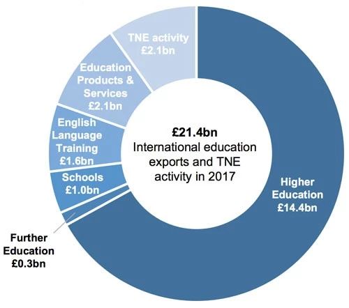 英国教育部(Department of Eucation)最近的一份分析报告估计,包括跨国教育项目在内,英国2017年的教育出口总额为214亿英镑(279亿美元)。