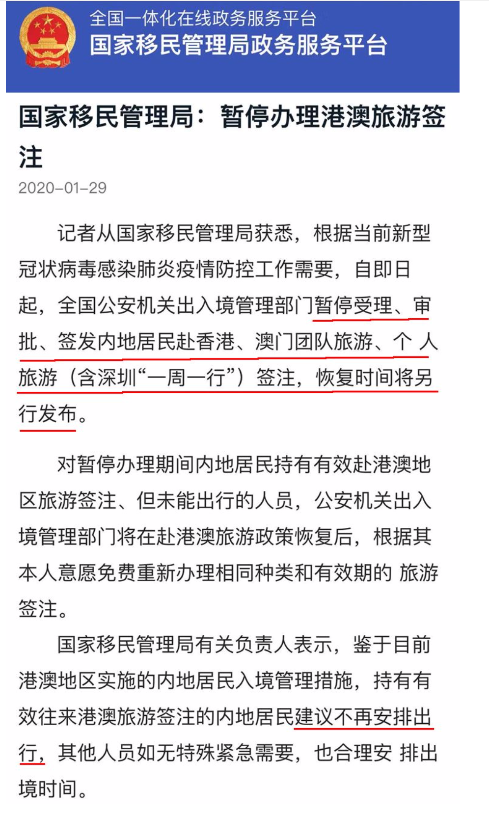 自1月29号起,中国全国公安机关出入境管理部门暂停受理、审批、签发内地居民赴香港、澳门团队旅游、个人旅游(含深圳“一周一行”)签注,恢复时间将另行发布。