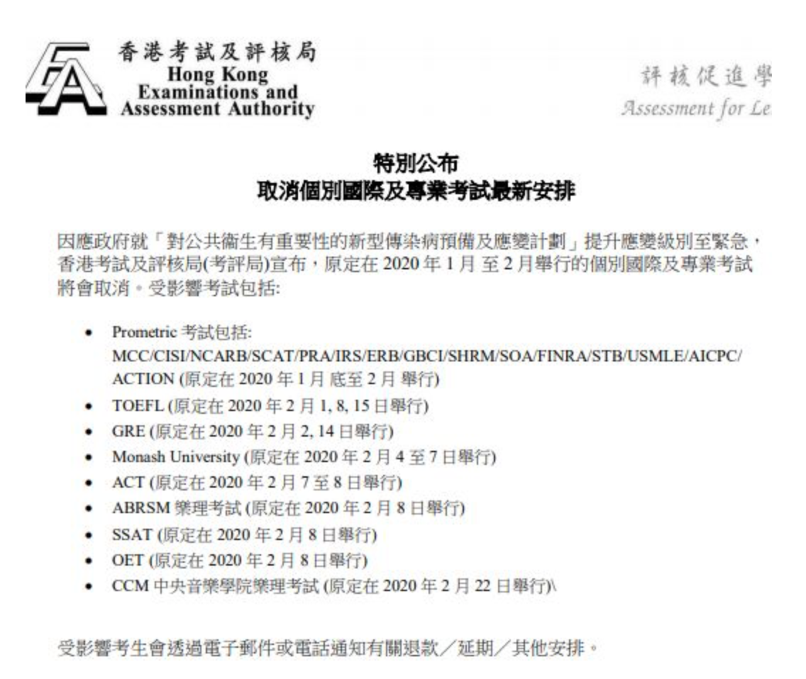 紧接着,1月31日,香港考试及评核局发布公告, 暂停2月份各种出国类考试。