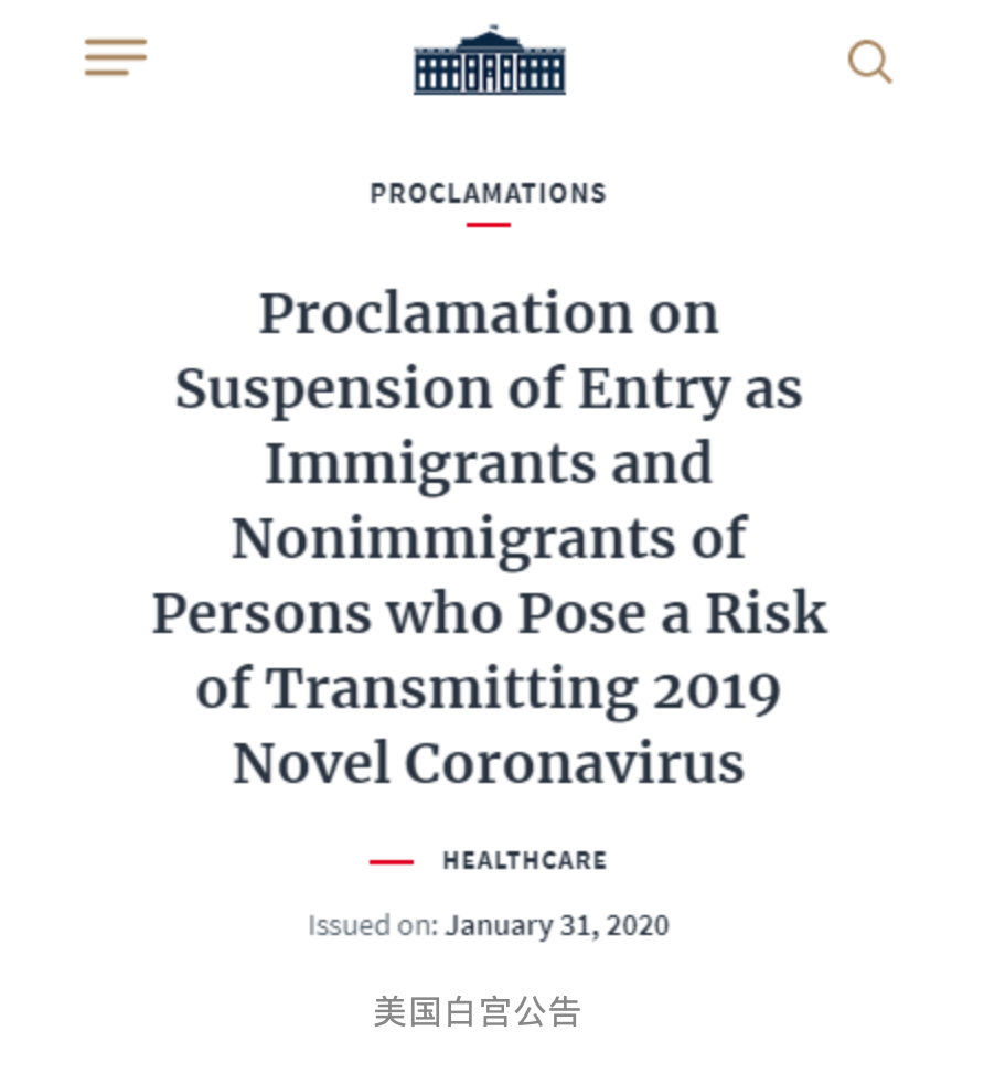 然而更不乐观的事情又随之而来。美东时间31日,美国卫生部长阿扎尔正式宣布: 美国进入公共卫生紧急状态。 自美东时间2月2日下午5时开始,过去14天内曾到访中国的外国人(美国公民和永久居民的直系亲属除外)将被暂时禁止入境,从中国大陆返回的美国公民将接受健康检查和长达14天的隔离。该禁令将于美国东部时间周日下午5点生效。取消时间待定。