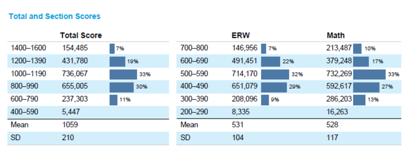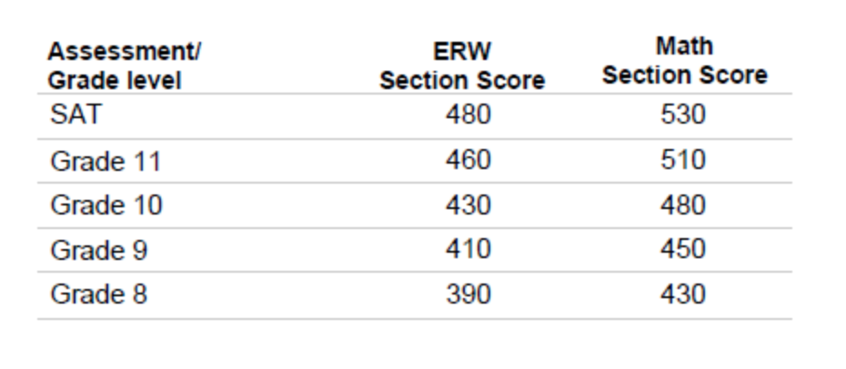 SAT总分是ERW(阅读与写作)和数学部分的总分,单项分数范围为200–800,因此总分数范围为400–1600。 大学和职业准备水平测试的依据是: ERW和数学分别为480和530。