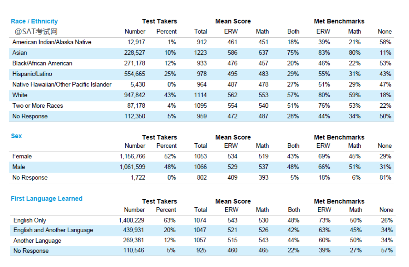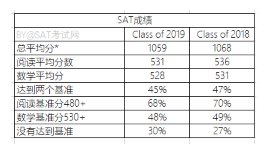 3、2019届SAT的平均总得分为1059,低于2018届的1068。 对,你没看错,国内SAT高分屡屡刷屏的情况下,整体SAT均分却在下降。