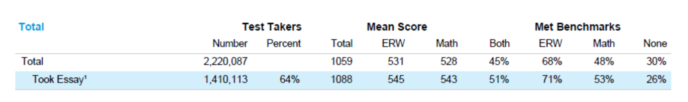 5、在2019届考生中,共有45%的学生达到大学基准线,有64%的考生参加了Essay考试,(尽管一部分大学说不需要写作成绩,但依然有很多学生选择了这部分考试,)。