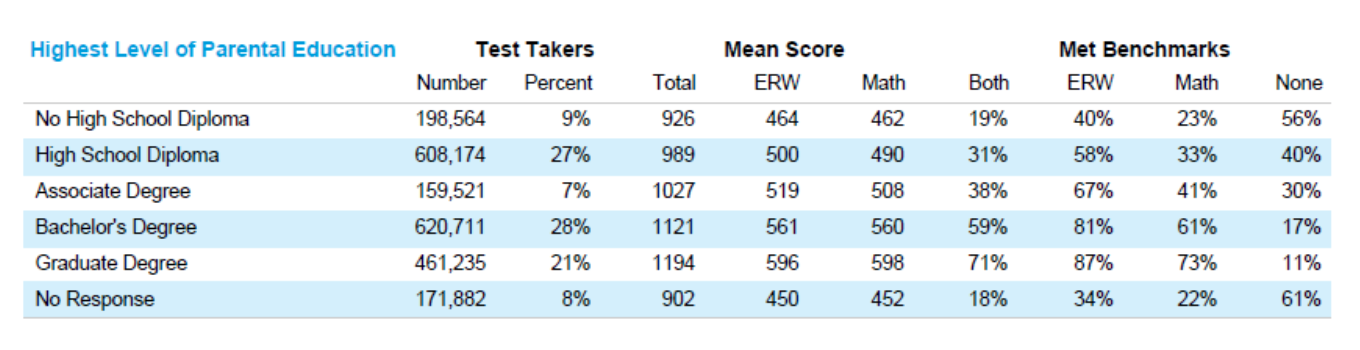 CB每年都不忘记拉仇恨,把SAT成绩和父母的教育背景扯上关系了,也就是说,你SAT分数不高,可能跟爸妈有关哦,父母的学历越高,SAT均分越高。