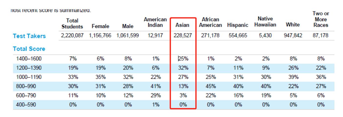 亚洲学生在高分数段的表现太亮眼了,这也就是大家刷到1500分,还没足够信心申请梦校的原因,高分太多,靠标化分数体现不出明显优势。