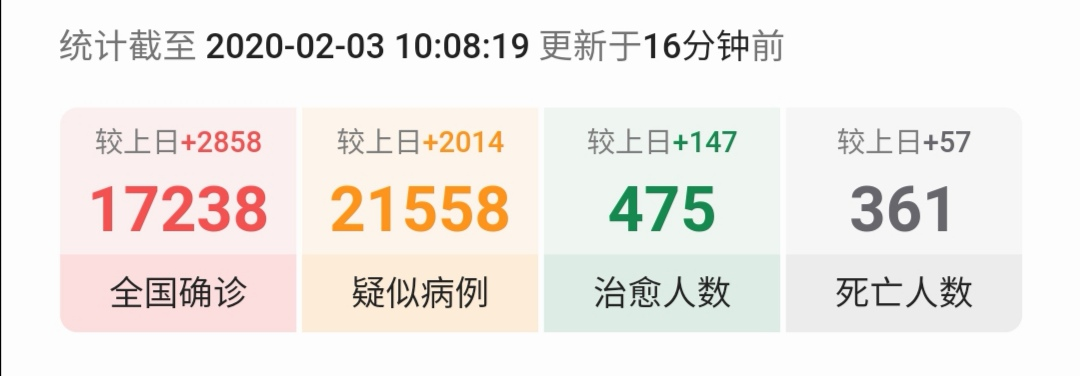 截至北京时间2月3日10时,我国累计报告新型冠状病毒感染的确诊病例17238例,疑似21558例,死亡361例,治愈475例。