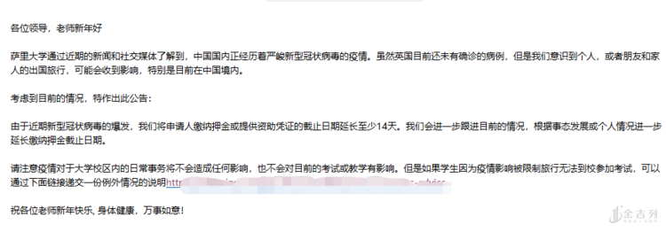 鉴于中国疫情,萨里大学将申请人缴纳押金的截止日期延长至少14天,并将根据事态发展随时更新。