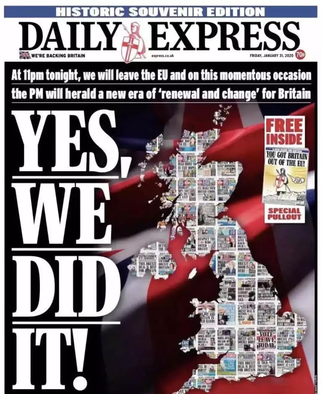 至此,英国彻底告别了47年的欧盟成员国身份。 《每日快报》刊出头版标题是: 是的,我们做到了。
