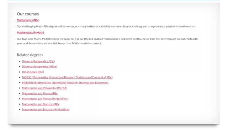 相关数学课程还有很多,不过分属于不同的系, Discrete Mathematics (BSc)和Discrete Mathematics (MEng)属于计算机系 ;