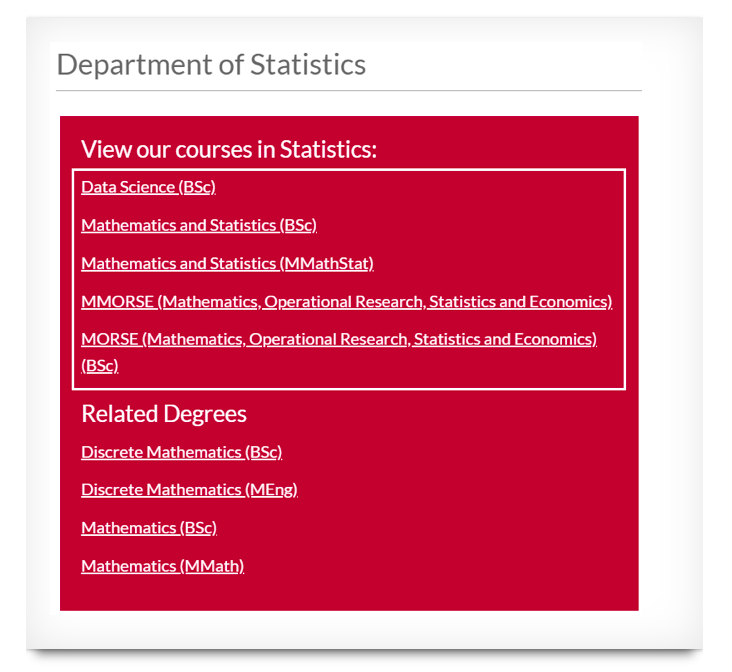 Data Science (BSc)、Mathematics an Statistics (BSc)、Mathematics an Statistics (MMathStat)、MORSE、MMORSE都属于统计系 ;